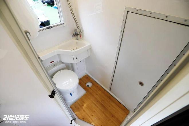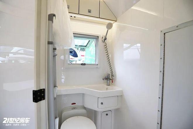 采用前置卫生间的设计,且与驾驶室开设了一道贯通舱门。这种设计的好处颇多,驾驶途中若驾驶员或副驾乘客需紧急如厕,只需通过驾驶室贯通门直接进入卫生间,全程无需踩踏生活区地板,节省时间。户外停留时,访客或临时乘员使用卫生间,也无需穿过卧室等私密区域,减少对车内私密空间的占用。