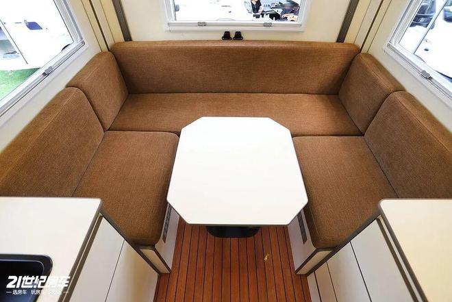 车尾部分是会客区,采用了U型卡座沙发+升降桌的设计,配合顶部一张电动升降床铺,为乘客提供了灵活多变的休息和娱乐空间。