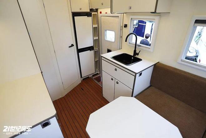 上门处两侧提供了厨房区的功能,右手边是两台12V80L的冰箱,用于储存食材和饮料;左手边配备了洗菜池和水龙头,可进行一些备菜的环节。