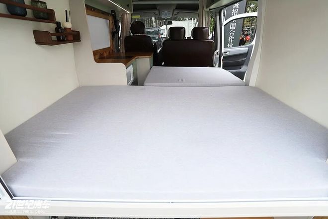 会客区配有双人位的乘用车座椅,副驾驶与后排座椅可拼接成1750×900mm的单人床,适合临时休憩或单人露营。当然,承担主要睡卧功能的还是后方的固定横床,1780×1200mm的尺寸,足够两名成年人舒适睡眠,床垫支撑性与透气性兼顾,长途露营也能睡个好觉。
