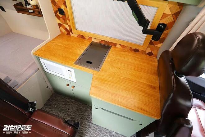 生活区左侧是一组L型的吧台,满足但不限于烹饪功能的“多功能区”。台面上内嵌了一个洗菜池,内有水龙头,洗漱、洗菜都能方便;顶部一排吊柜可以储存出门在外的行李物品。下方的微波炉可用来加热一些简单的食品;右侧的“抽屉”实际上内嵌了一个45L房车专用冰箱,用来冷藏冷冻食材和饮料再适合不过了。