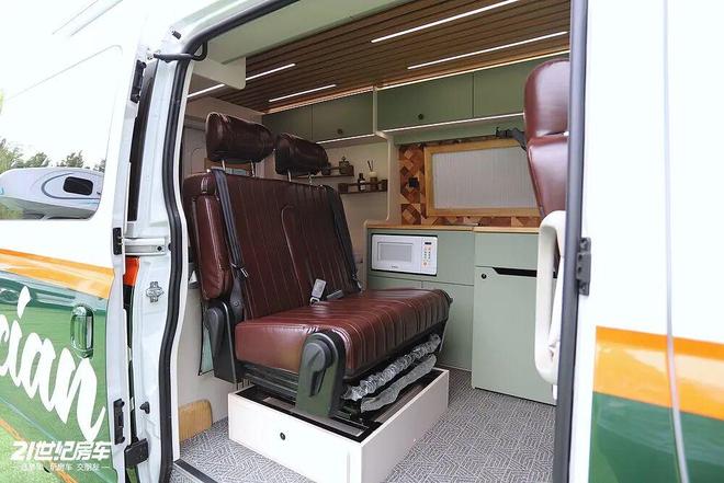 进入生活区,VanLife风扑面而来,云岫绿的家具配合美式复古皮质座椅给人一种蜗居的踏实感。宿营车的核心优势在于空间利用率,通过座椅与床的灵活组合,实现通勤、休憩、睡眠多种场景切换。