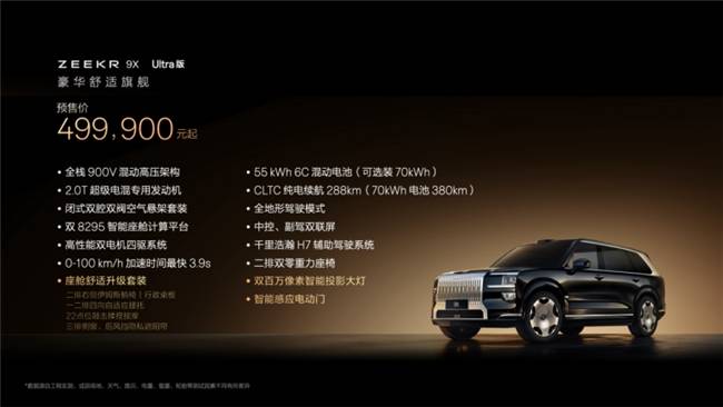在车型选择上,极氪9X目前共推出了Max版、Ultra版和Hyper版。其中,Max版配置就已经拉满,能够满足日常绝大多数用车需求。如果经常和家人一起出门,那Ultra版会是个很好的选择,其在Max版基础上,增加了包括二排右侧伊姆斯躺椅、一二排四向自适应腰托、22点位敲击揉捏按摩等配置和功能在内的座舱舒适升级套装,另外还有双百万像素智能投影大灯和智能感应电动门,在舒适性和便利性方面都有所提升。而如果经常进行商务接待或想一步到位,可以直接上Hyper版,满足所有豪华需求。